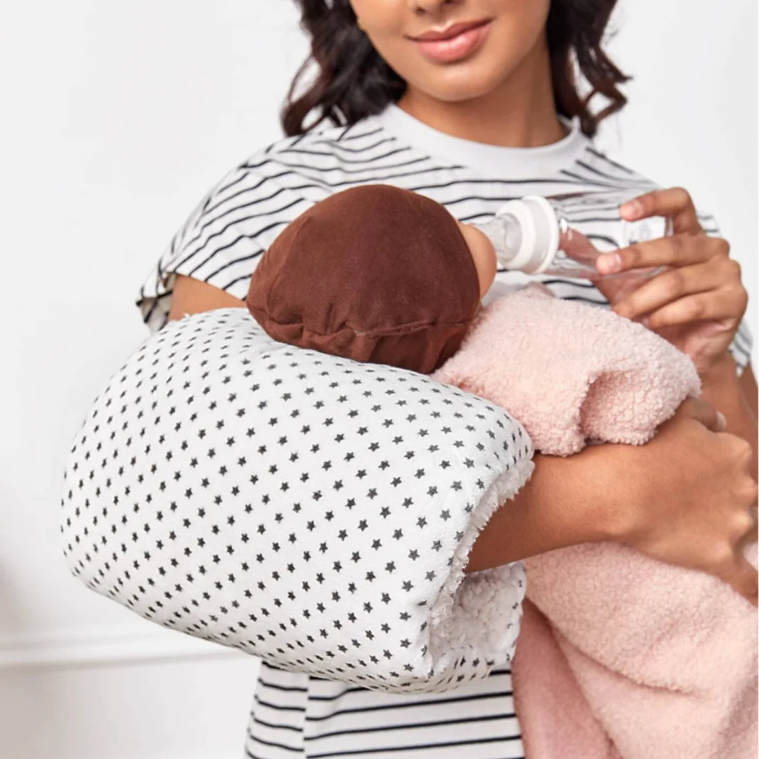 "After using this pillow, I can't believe how foolish I was with a flat feeding pillow. Not feeding in the right position often led to long nights, never-ending burps, spit-ups, stomach aches, and my baby's discomfort. This pillow changes everything. It's so comfortable and effortless, making long feeding sessions pain-free. I can even binge-watch Netflix for hours without feeling like I'm holding a baby. It eliminates reflux problemsburps and discomforts. Feeding time is now a breeze, a true game-changer for any new parent!" - ⭐⭐⭐⭐⭐ Carolin W.